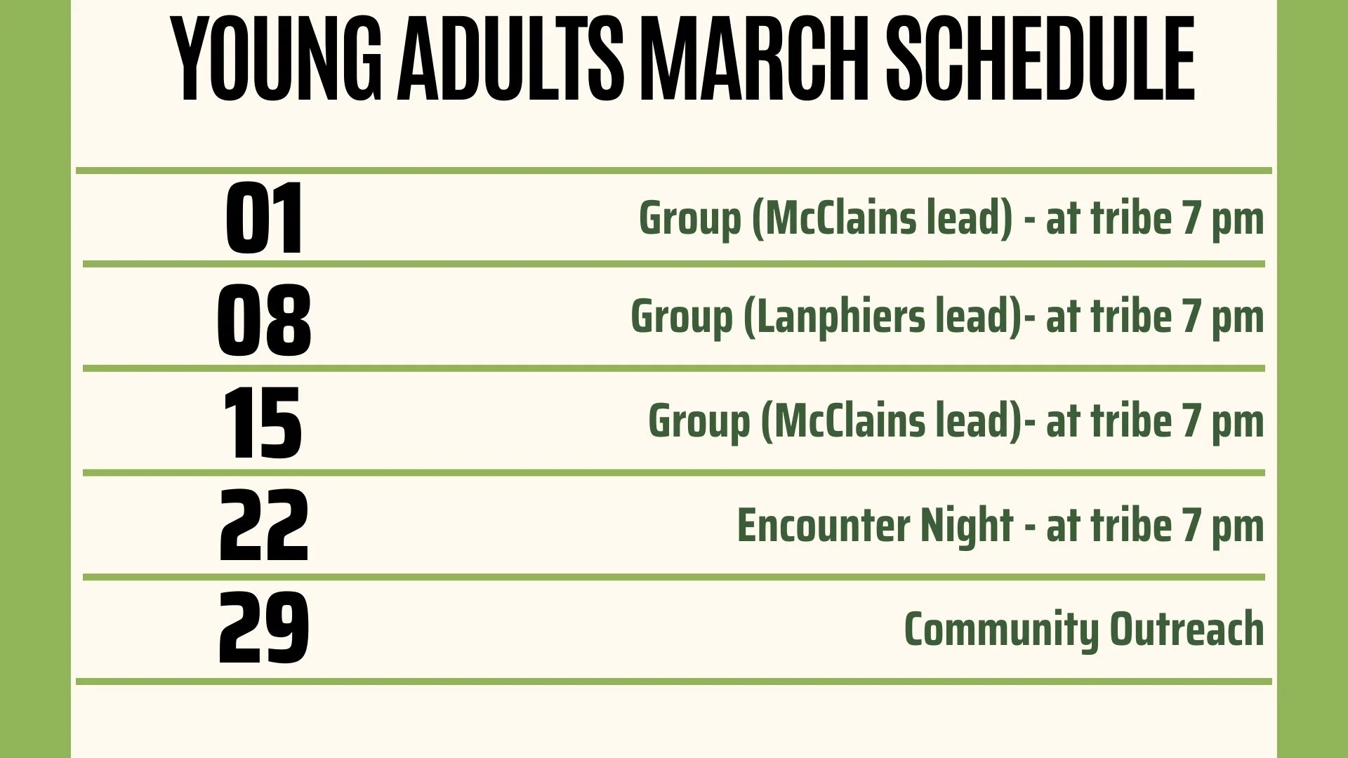SUNDAY NIGHT GROUPS: Always at 7pm in the Tribe youth room! *Other than the 8th, come at 5pm!*